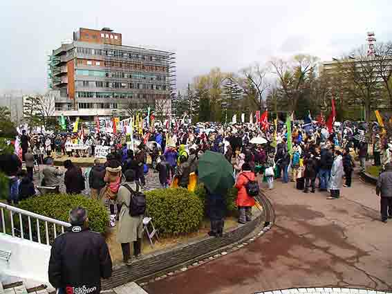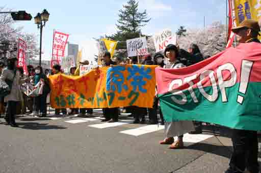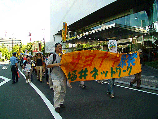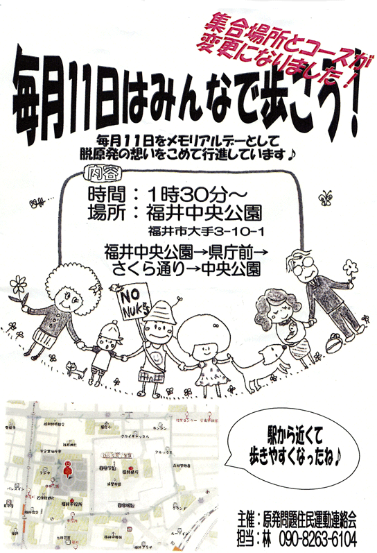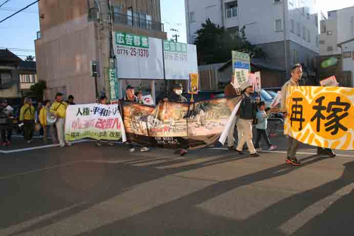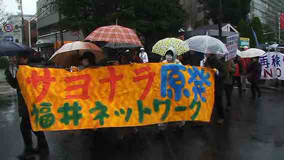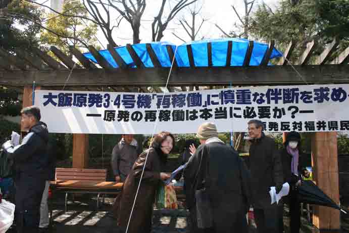 主催団体である「原発に反対する福井県民会議」の中島哲演代表委員の論理的で熱のこもったスピーチ(断食を県庁にて行うとの表明も)、「サヨナラ原発福井ネットワーク」山崎隆敏代表による「関西電力大飯原発3、4号機の拙速な再稼働に反対する意見書」を全会一致で採択した越前市議会議長・嵐等氏からのメッセージ代読のほか、各地の団体から連帯のメッセージも寄せられました。冷たい雨の中、デモを行い再稼動反対、原発なくそうと訴えました。