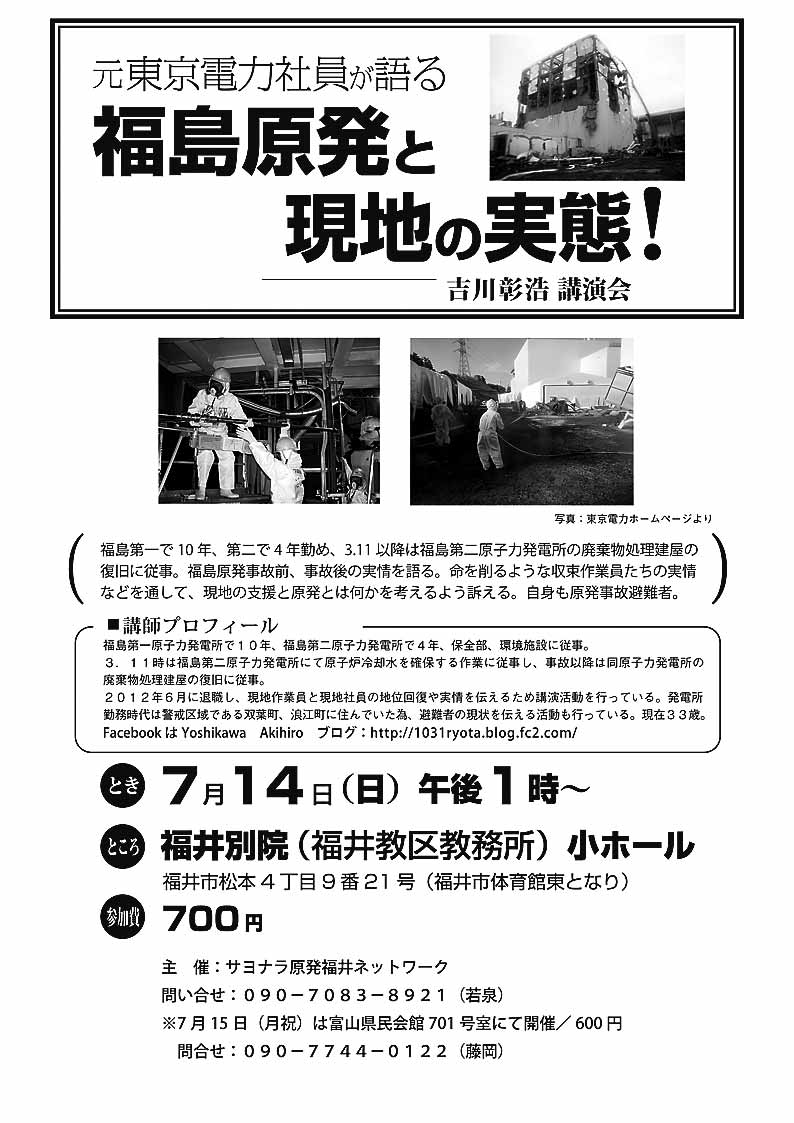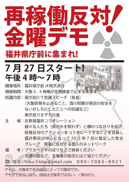 福井県では、福井県原子力安全専門委員会が安全性の確認をする------->県議会全員協議会で再稼働の可否を討議する--------->県知事の判断をすることになっています。サヨナラ原発福井ネットでは現在専門安全委員へ安全が確保できるのかの問いかけをしています。また県会議員に働きかけをしているところです。