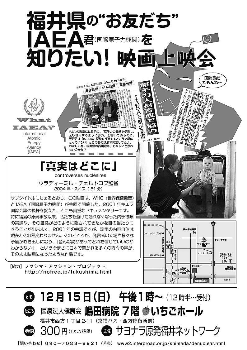 講演内容 IAEAの成り立ちから、国連の安保理事会に属しているので発言力が高い。1991年にはチェルノブイリの健康被害を不当に低く評価している。(死者が31〜32人 白内障と甲状腺癌のみと断定)。またWHOとの関係では、その活動はIAEAに諮り共通の合意で行うという文書がかわされた。福井県とIAEAの覚え書きでは 原子力発電に当たっての地域住民との関わり など 応用では陽子線治療 PET診断 等が記されている。