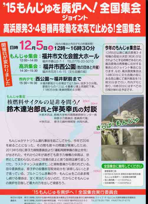 毎年行われている もんじゅを廃炉に!の集会と、仮処分の意義申し立てに対する決定が出されようとしている高浜の再稼動阻止の集会がおこなわれます。文化会館とその前にある西公園で行われます。